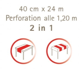 Luxusná šerpa 40 cm x 24 m z Airlaid / Linclass = netkaný textil = moderná náhrada textilu. MOC je za 1 ks. Každých 120 cm je nenápadne perforovaná, čo vám dá možnosť tieto časti odtrhnúť a nastierať "tvárou k tvár" - oproti sebe. 1 kartón = 4 ks.