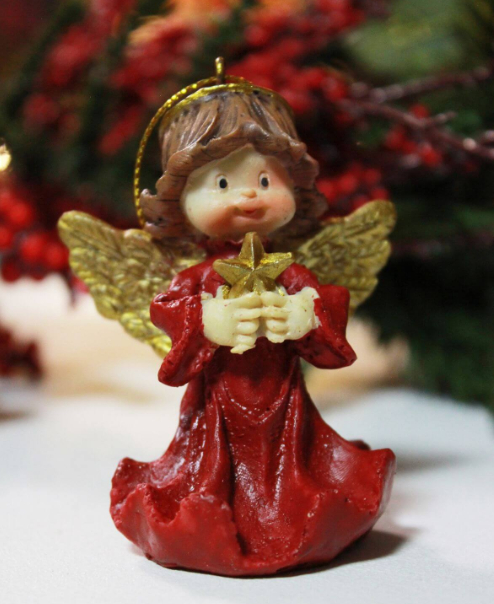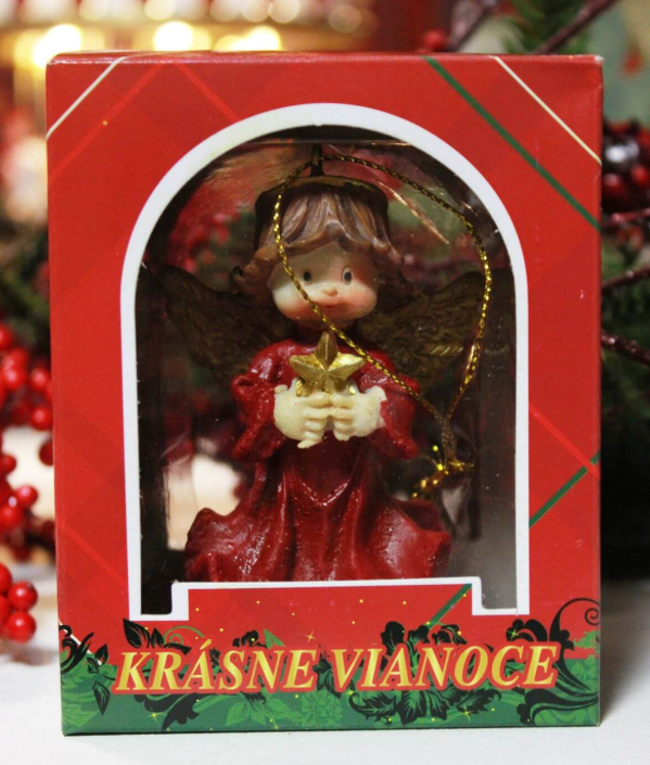 Červená rozprávková vianočná závesná ozdoba anjelika držiaceho zlatú hviezdu. Táto vianočná ozdoba má zlaté lanko na zavesenie a dá sa použiť aj ako figúrka do aranžmánov.