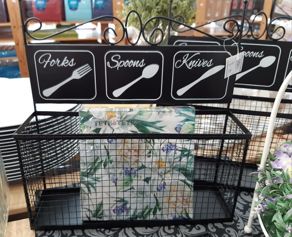 Kovový závesný, či s možnosťou ležiaci na polici priestor na odkladanie príboru, kuchárskej knihy,...31 x 30 x 8,5 cm.