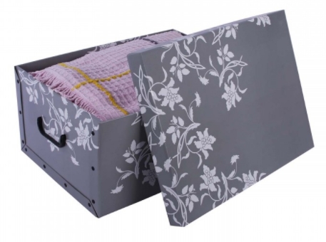 Praktické pevné skrinky s viečkami vyrobené z odolnej 100% recyklovanej lepenky úhľadne uložia oblečenie alebo doplnky. Dokončené bočnými úchytkami z PVC na uľahčenie pohybu, sú zvýraznené romantickým vzorom, ktorý dotvára všetky nevyhnutné detaily pre nové usporiadanie šatníka ... s nádychom kreativity! Krabica je vyrobená výhradne v Taliansku a vyrobená z odolnej lepenky, ktorá umožňuje čistenie pomocou vlhkej handričky. Sú navrhnuté tak, aby sa vďaka rôznym dostupným veľkostiam prispôsobili každému typu šatníka, a sú užitočné na ochranu každého druhu odevu pred prachom, špinou a roztočmi.