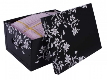 Praktické pevné skrinky s viečkami vyrobené z odolnej 100% recyklovanej lepenky úhľadne uložia oblečenie alebo doplnky. Dokončené bočnými úchytkami z PVC na uľahčenie pohybu, sú zvýraznené romantickým vzorom, ktorý dotvára všetky nevyhnutné detaily pre nové usporiadanie šatníka ... s nádychom kreativity! Krabica je vyrobená výhradne v Taliansku a vyrobená z odolnej lepenky, ktorá umožňuje čistenie pomocou vlhkej handričky. Sú navrhnuté tak, aby sa vďaka rôznym dostupným veľkostiam prispôsobili každému typu šatníka, a sú užitočné na ochranu každého druhu odevu pred prachom, špinou a roztočmi.