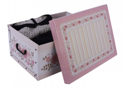 Praktické pevné skrinky s viečkami vyrobené z odolnej 100% recyklovanej lepenky úhľadne uložia oblečenie alebo doplnky. Dokončené bočnými úchytkami z PVC na uľahčenie pohybu, sú zvýraznené romantickým vzorom, ktorý dotvára všetky nevyhnutné detaily pre nové usporiadanie šatníka ... s nádychom kreativity! Krabica je vyrobená výhradne v Taliansku a vyrobená z odolnej lepenky, ktorá umožňuje čistenie pomocou vlhkej handričky. Sú navrhnuté tak, aby sa vďaka rôznym dostupným veľkostiam prispôsobili každému typu šatníka, a sú užitočné na ochranu každého druhu odevu pred prachom, špinou a roztočmi.