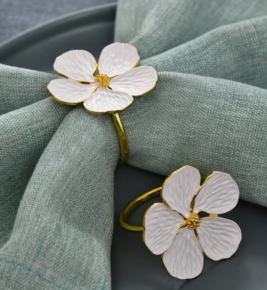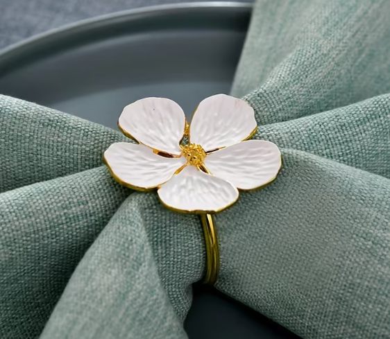 Elegantné biele perleťový kvetinové prsteň na obrúsok 4 x 4 cm so zlatými akcentmi na svadby, Veľkú noc a formálnu Stolovanie .
