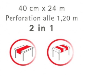 Luxusná šerpa 40 cm x 24 m z Airlaid / Linclass = netkaný textil = moderná náhrada textilu. MOC je za 1 ks. Každých 120 cm je nenápadne perforovaná, čo vám dá možnosť tieto časti odtrhnúť a nastierať "tvárou k tvár" - oproti sebe. 1 kartón = 4 ks.