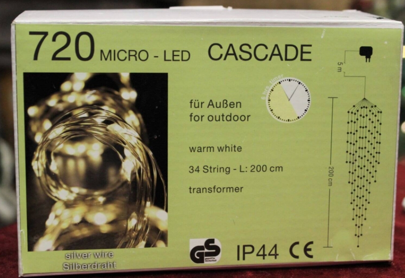 Vianočné LED osvetlenie v tvare vodopádu s 34 lankami vhodné na vianočný stromček. Farba je teplá biela. 720 LED svetiel s G.S. adaptérom 6V 6W, IP44.